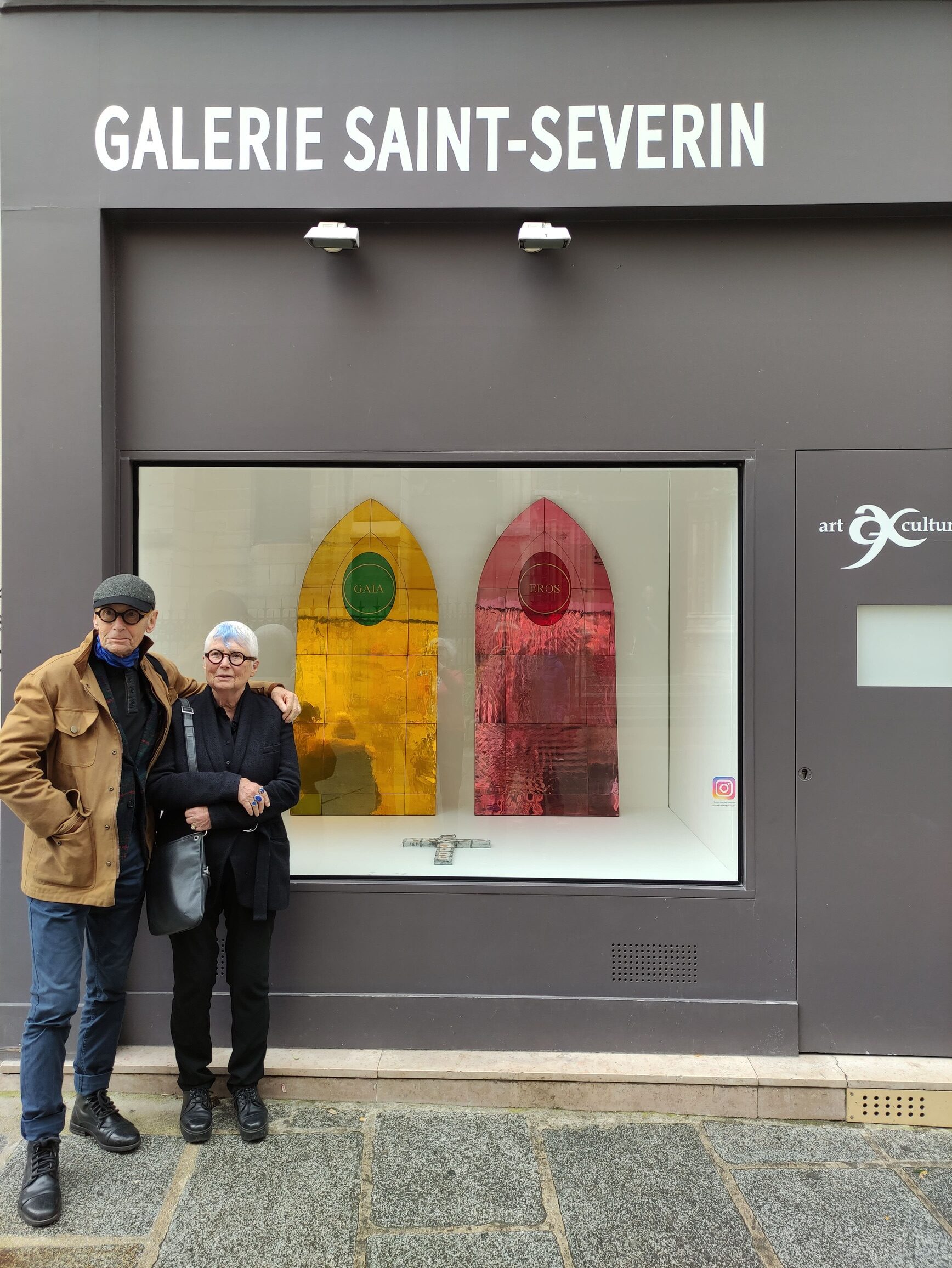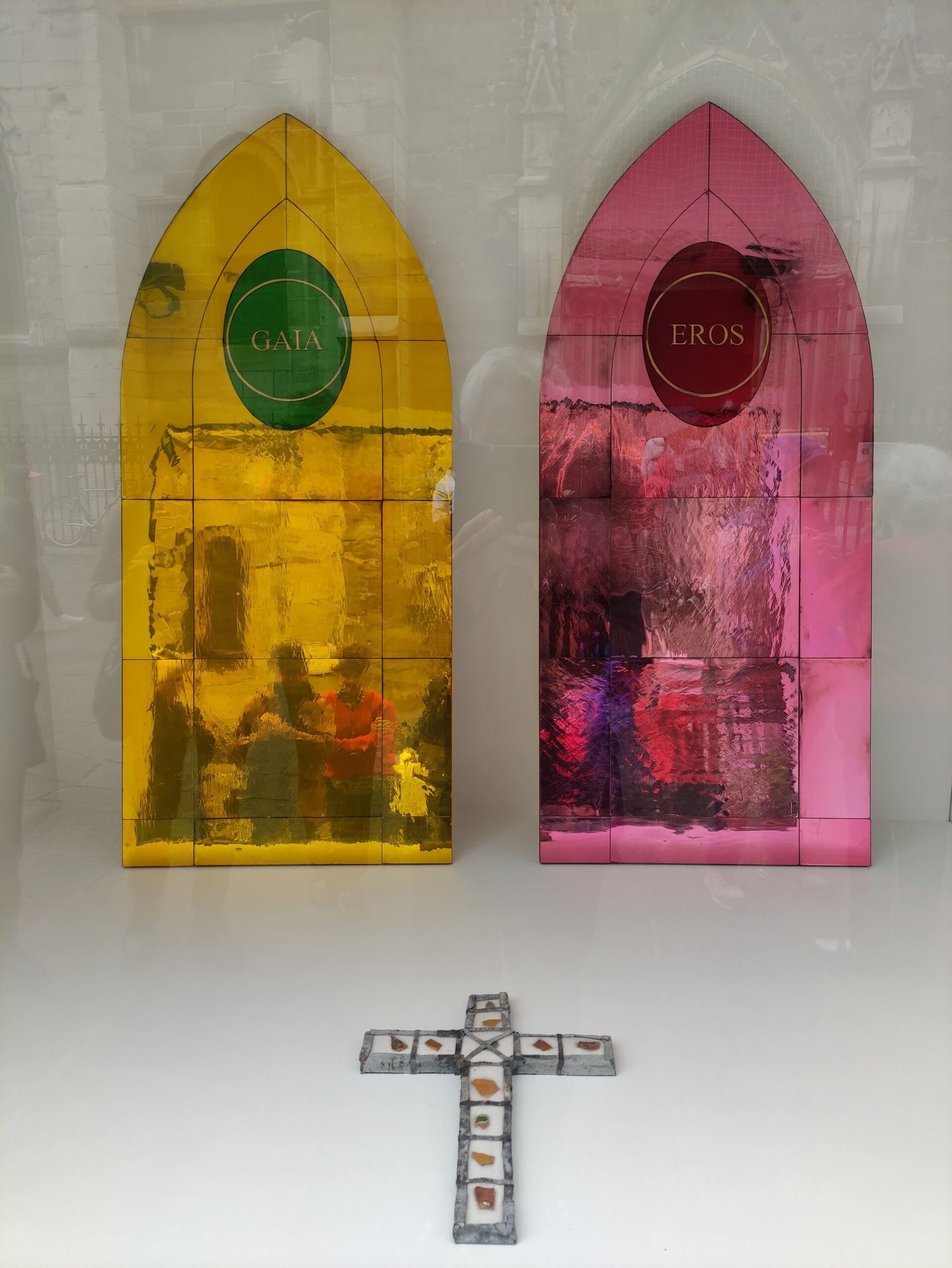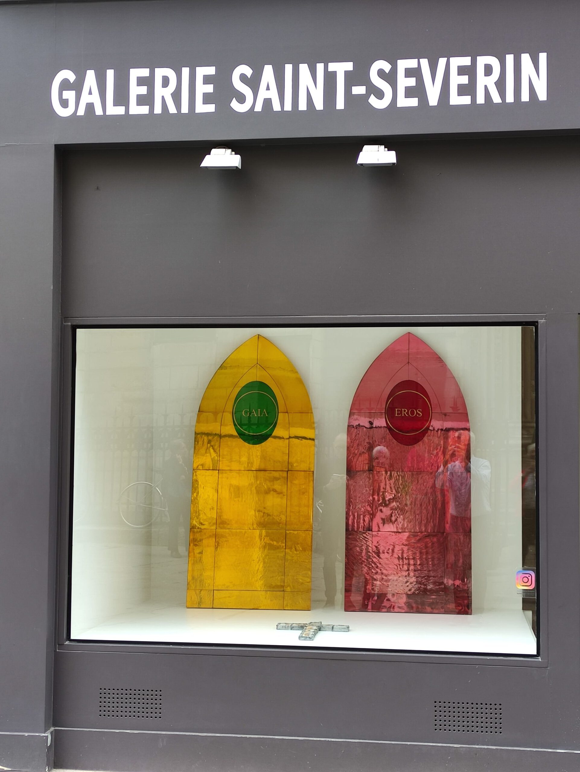 L’installation colorée d’Anne et Patrick Poirier lance un hymne à la vie, la vie en abondance. Ces deux fenêtres en verre antique argenté, Eros et Gaïa, s’inscrivent dans la suite des miroirs créés pour le Palazzo Butera à Palerme (2018). Elles ont été montrées pour la première fois par Jean-Gabriel Mitterrand dans l’exposition Errances (2021) au Domaine du Muy. Ces miroirs en ogive, écho contemporain des baies de l’église Saint-Séverin qui leur fait face, renvoient l’image du monde dans