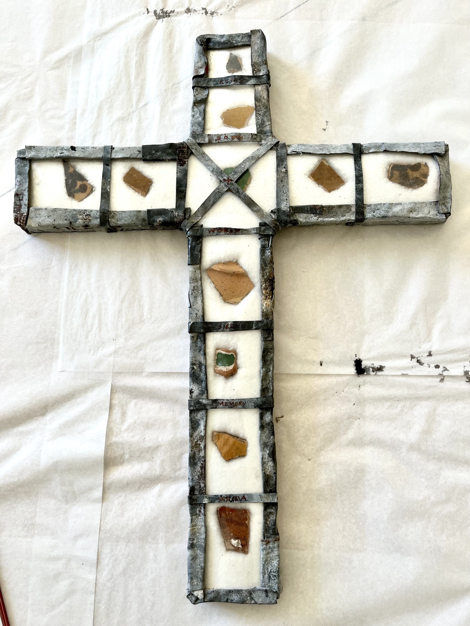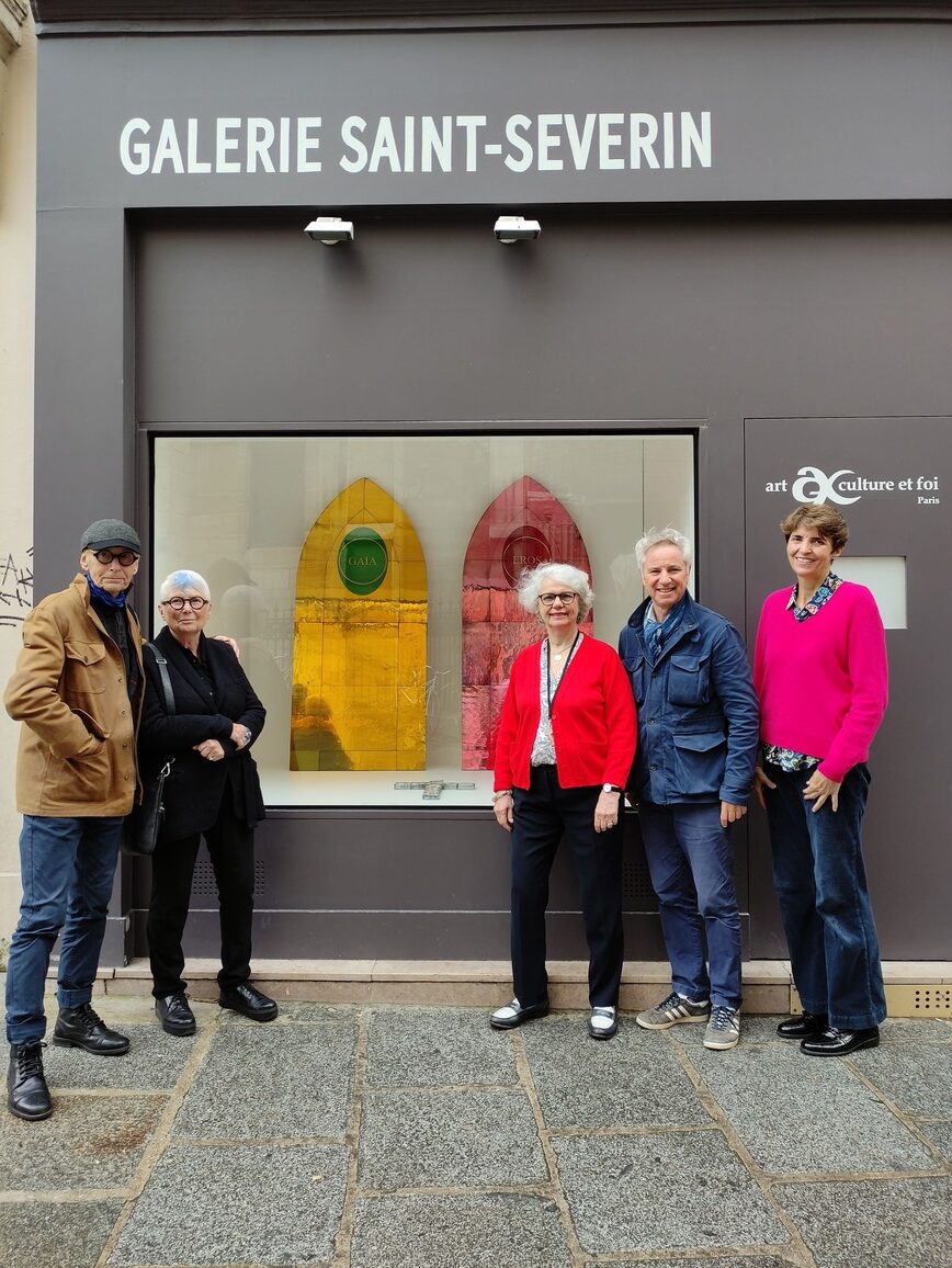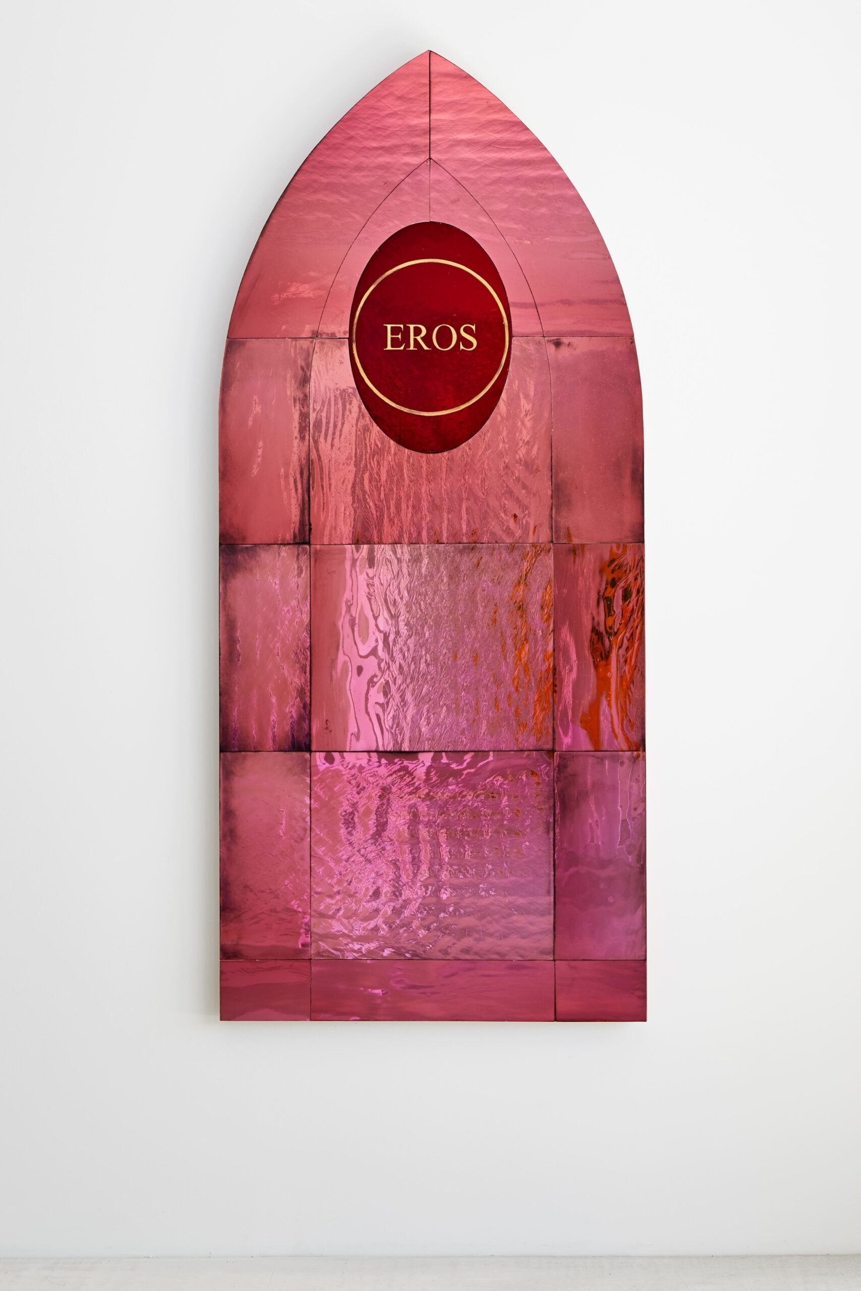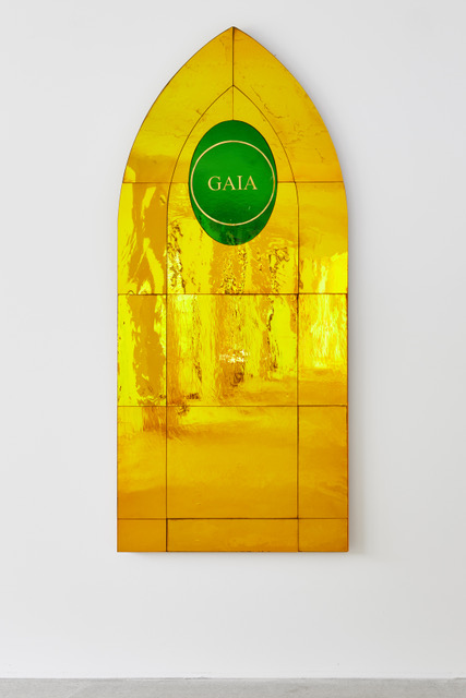 L’installation colorée d’Anne et Patrick Poirier lance un hymne à la vie, la vie en abondance. Ces deux fenêtres en verre antique argenté, Eros et Gaïa, s’inscrivent dans la suite des miroirs créés pour le Palazzo Butera à Palerme (2018). Elles ont été montrées pour la première fois par Jean-Gabriel Mitterrand dans l’exposition Errances (2021) au Domaine du Muy. Ces miroirs en ogive, écho contemporain des baies de l’église Saint-Séverin qui leur fait face, renvoient l’image du monde dans