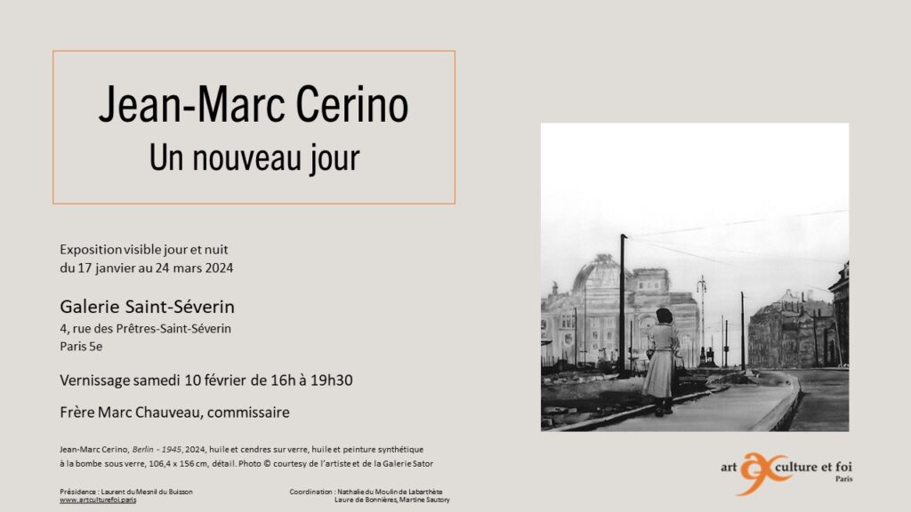 Cette peinture de Jean-Marc Cerino est comme un écho suspendu de l’Allemagne en ruines et de sa future reconstruction. On pense aux Trümmerfrauen, ces Femmes des ruines qui, après la Seconde Guerre mondiale, aidèrent à débarrasser les villes des pierres des bâtiments qui avaient été bombardés. Anselm Kiefer évoque ces femmes dans plusieurs de ses œuvres. On pense également à son œuvre Résurrection, créée en 2019 pour le couvent de La Tourette : 50 m2 de gravats et de blocs de béton au milieu desquels de grands tournesols blancs s’élevaient dans le ciel, signes d’une vie qui reprend. La ruine comme point de départ d’une nouvelle vie. D’un nouveau jour.