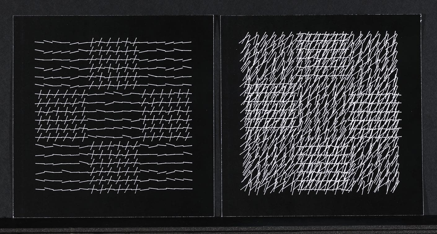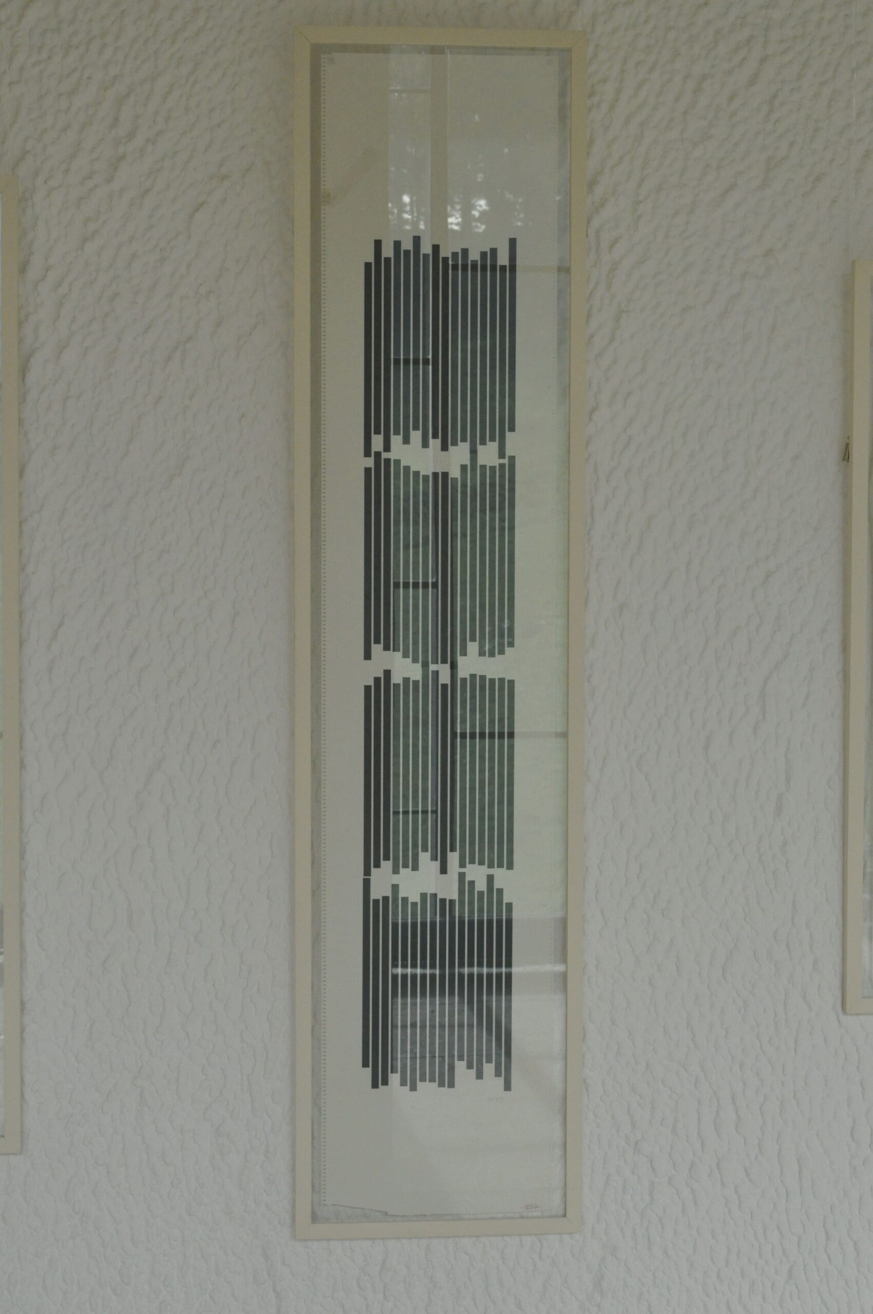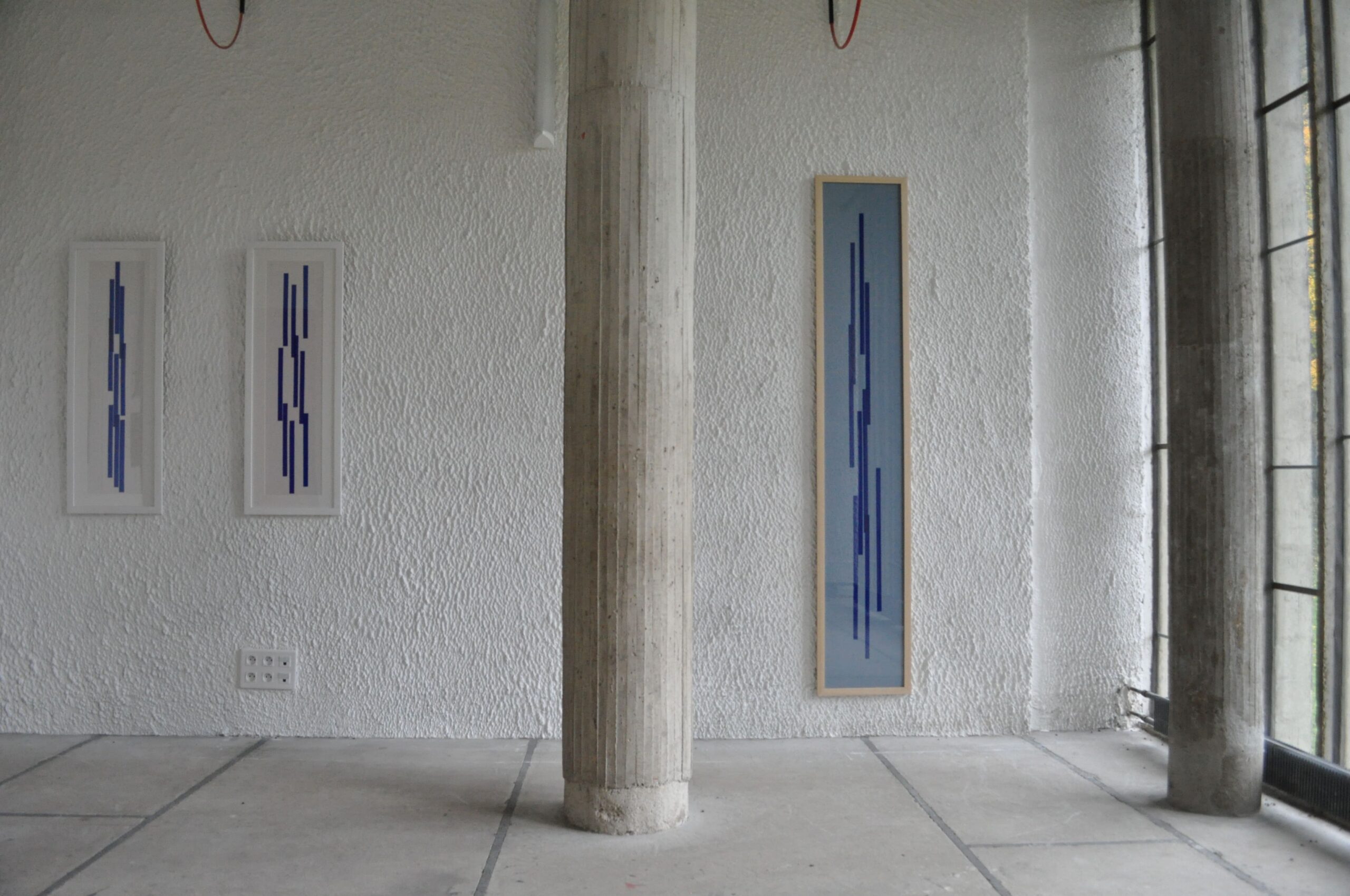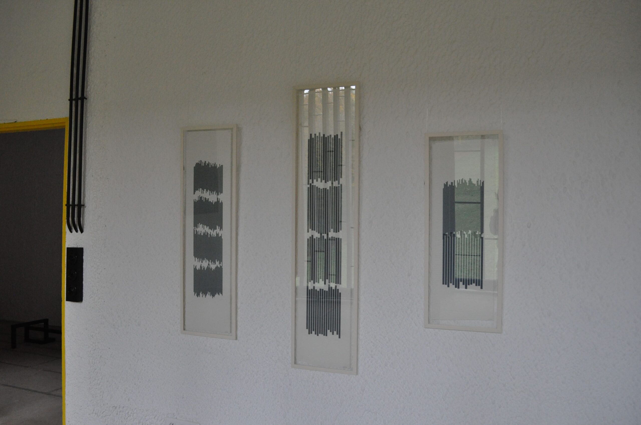 – les rythmes verticaux des œuvres de Vera Molnar, peintre de l’abstraction géométrique, entrent délicatement en dialogue avec les pans de verre ondulatoires de Xenakis ;