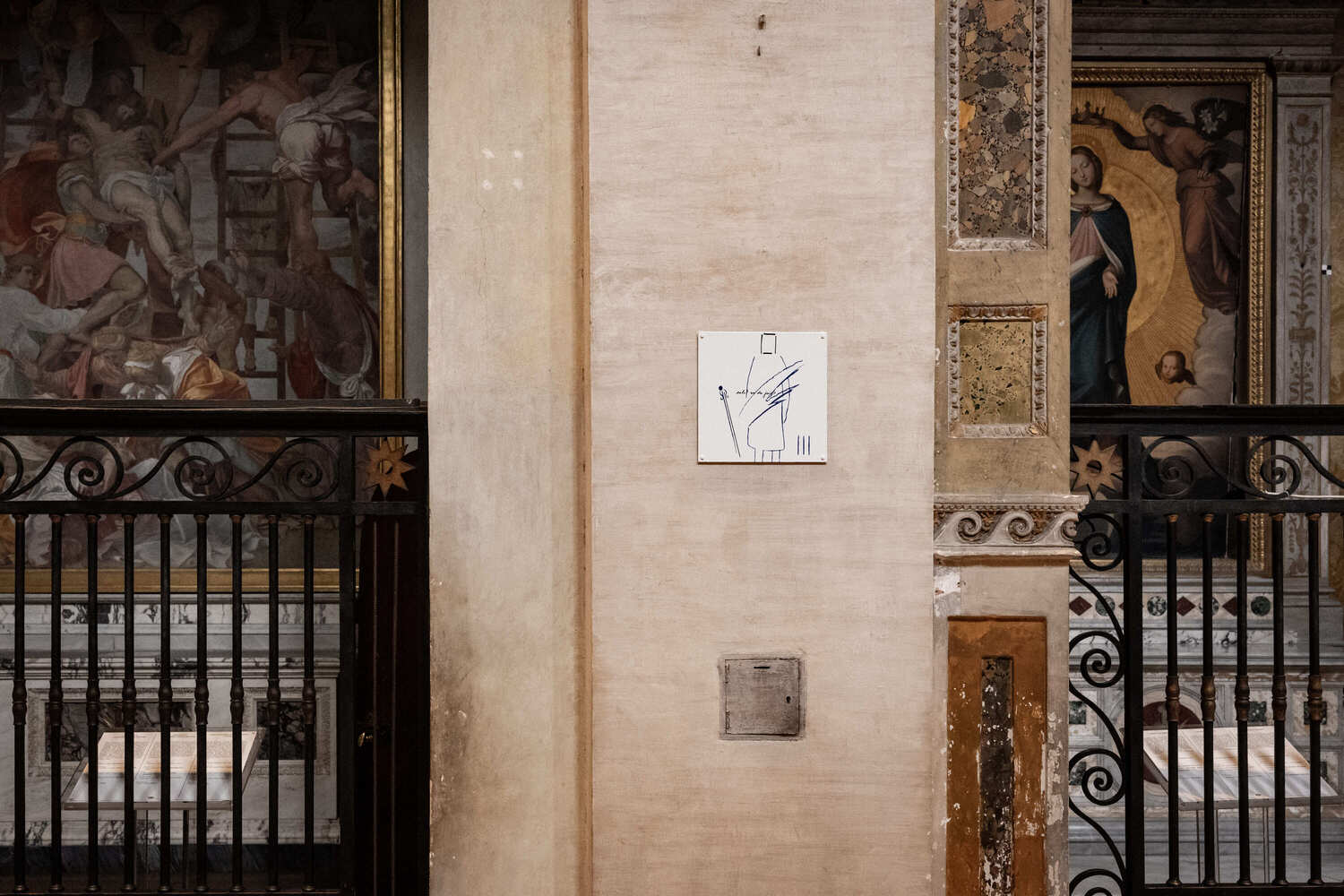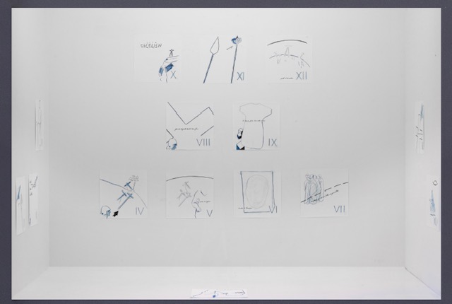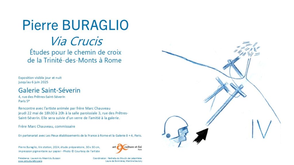 À l’invitation du Frère Renaud Escande, o.p. directeur des Pieux établissements de la France à Rome, Pierre Buraglio a réalisé un chemin de croix – Via Crucis – pour l’église de la Trinité-des-Monts à Rome qui a été installé en janvier dernier. La Galerie Saint-Séverin a le plaisir de vous présenter l’ensemble des esquisses offrant ainsi la possibilité au public parisien de voir cette création. L’artiste a écrit un texte pour expliquer chacune des 15 stations de son Chemin de croix. On pourra mesurer combien son travail se nourrit de l’iconographie chrétienne à travers les âges et de ses rencontres avec les œuvres dans les musées.